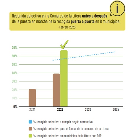 Si acercamos el foco a los municipios literanos con recogida puerta a puerta, los resultados mejoran espectacularmente, llegándose a un porcentaje de un 67,52% de recogida selectiva, que los sitúa por encima del objetivo legal para 2025 e incluso para 2030. “Con estos datos podemos asegurar que los vecinos de La Litera eludirán las sanciones previstas en la normativa por no cumplir los porcentajes de reciclaje que marca la Unión Europea”, declara la Presidenta de la entidad comarcal, Tania Solans.